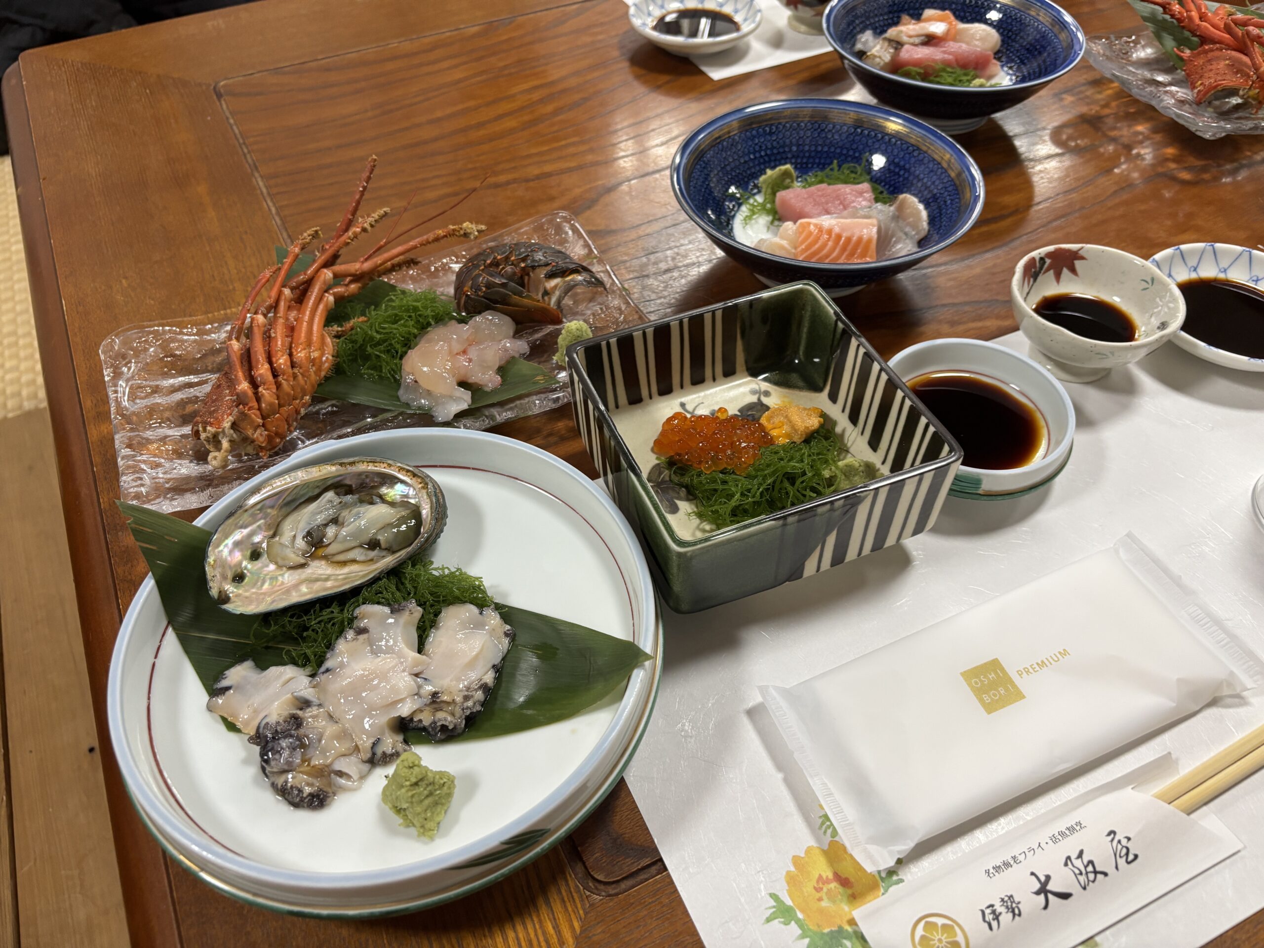 この日の食事では、伊勢海老 やあわびなど伊勢ならではの食材を堪能。